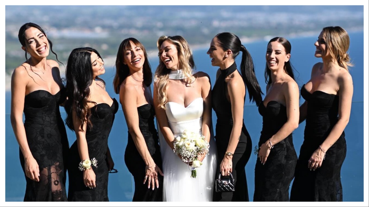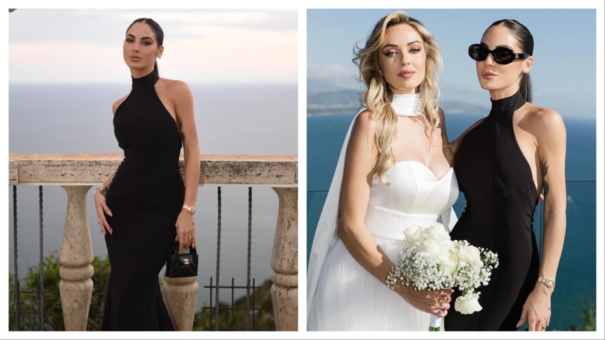 Ad infrangere il dress code nuziale sono state le damigelle tra cui spiccava Giulia De Lellis. Tutte erano vestite rigorosamente di nero. Un colore tradizionalmente bandito da eventi di questo genere. L’ex corteggiatrice di “Uomini e Donne” ed ex concorrente del “Grande Fratello Vip” ha indossato un abito a collo alto, con scollo all’americana e schiena completamente scoperta. Di recente, anche Monica Bellucci ha optato per un outfit look black per le nozze dell’amica Ilaria D’Amico, di cui è stata testimone, con Gigi Buffon. L’abito Sirio sfoggiato da Giulia De Lellis alle nozze della cugina Alice è firmato Atelier Emé e costa 390 euro. Le altre damigelle indossavano un modello simile ma con scollatura a cuore. Dello stesso brand anche il vestito della sposa.
