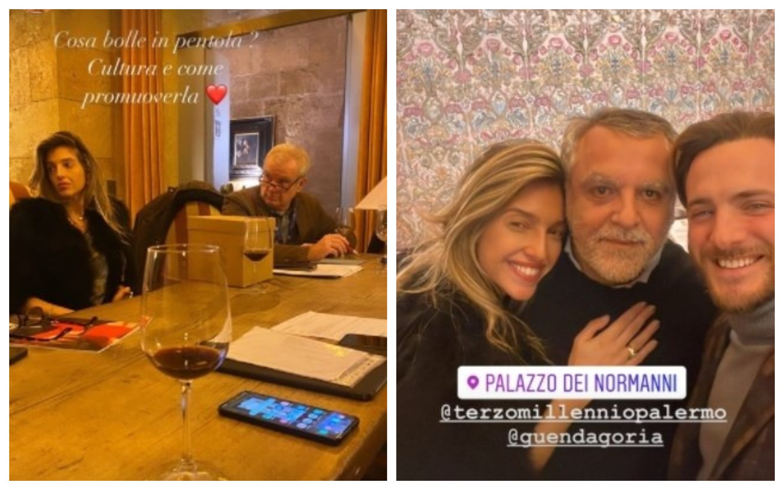 “Giornata proficua al Parlamento Siciliano insieme alla mia dolce metà Guenda Goria #ars #incontri #cultura #artespettacolo #promuoviamolitalia”, ha scritto Mirko Gancitano su Instagram. “Cosa bolle in pentola? Cultura e come promuoverla”, ha aggiunto in una Story. A Palazzo dei Normanni la coppia si è immortalata con Andrea Peria, titolare dell’agenzia di spettacoli Terzo Millennio. In serata, Guenda e Mirko hanno fatto tappa da Nino u’ ballerino, re dello street food palermitano. “Amici, continuando a parlare d’arte non possiamo non considerare l’arte culinaria. Allora parliamo di street food e di un’istituzione di Palermo”, ha detto Guenda in una breve clip.