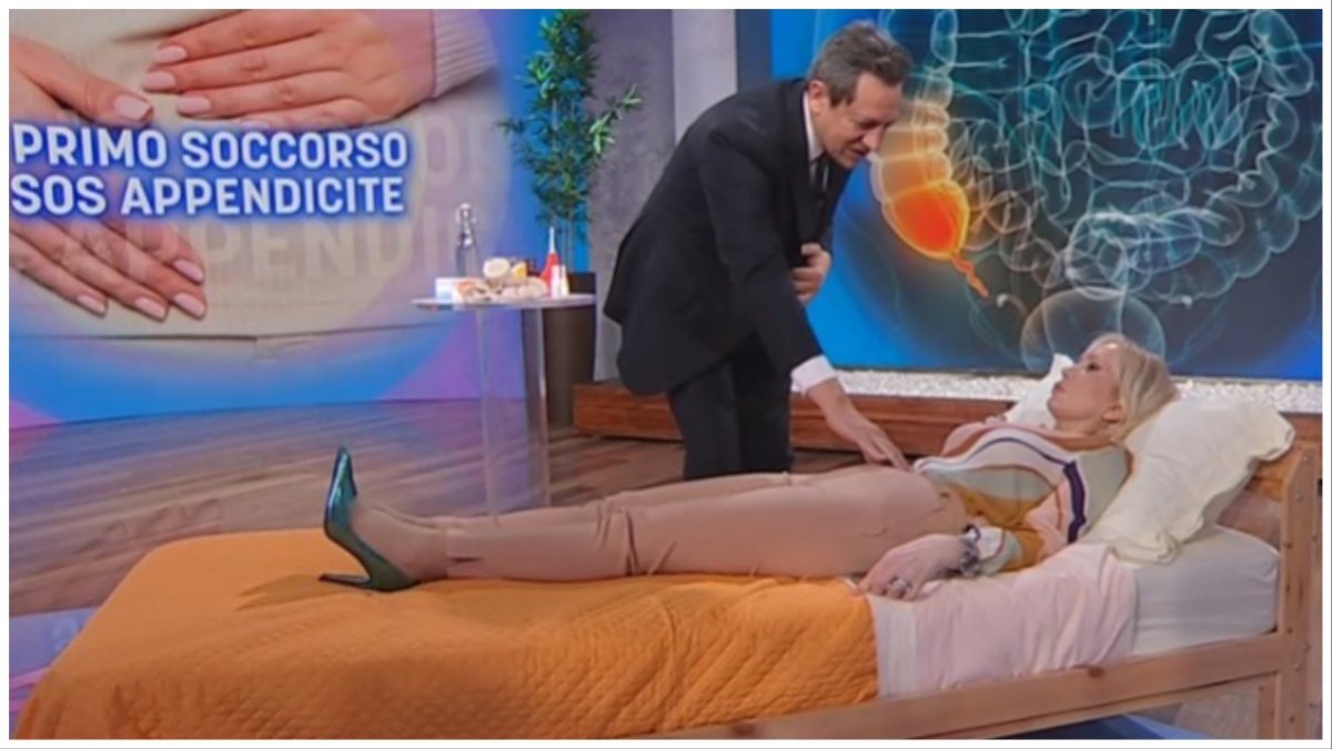 La padrona di casa ha dato la parola a Francesco Franceschi, direttore Medicina d’urgenza e Pronto Soccorso del Policlinico Gemelli di Roma. Il medico ha spiegato come come riconoscere l’appendicite: “Quando un viscere si infiamma si paralizza, può compare il vomito ed esserci un’occlusione intestinale”. Vira Carbone si è improvvisata paziente e si è stesa sul lettino.
