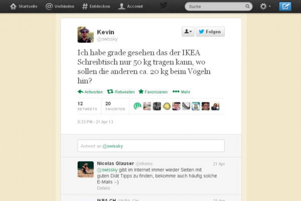 La lamentela arriva tramite Twitter da un utente per nulla soddisfatto. I mobili Ikea, secondo lo svedese Kevin Kyburz, sarebbero in grado di sopportare un peso massimo di 50 chili. Davvero pochi per chi volesse utilizzarli quale piano d’appoggio per incontri focosi. La risposta del colosso d’arredamento non tarda ad arrivare.