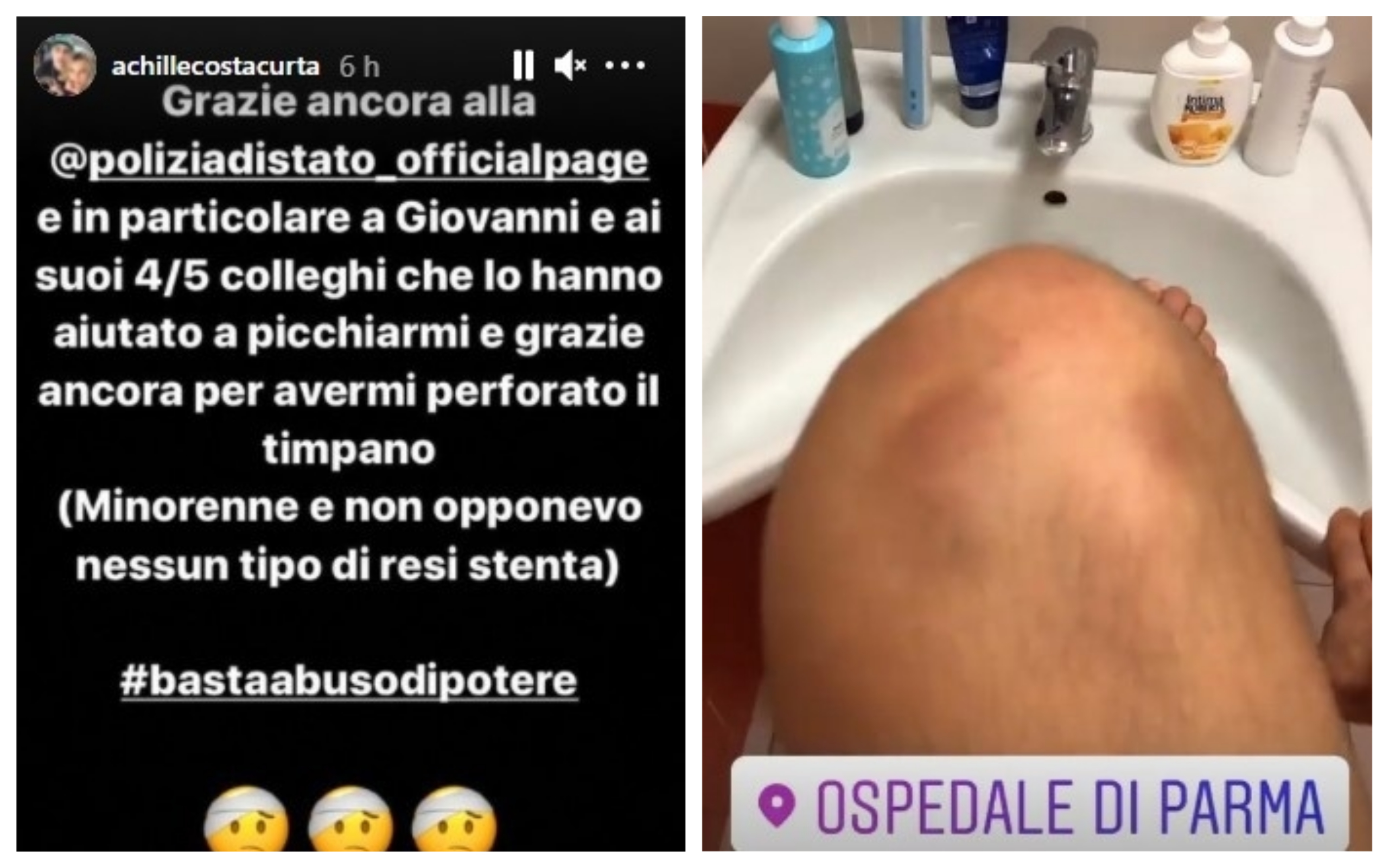 “Questo è quello che succede a un ragazzino di 16 anni quando incontra la Polizia di Stato, che la gente elogia tanto. Mi hanno picchiato e per precisare mi hanno perforato il timpano e ora mi dovrò operare solo per averli chiamati sbirrazzi. Basta abuso di potere”. E ancora: “Grazie in particolare a Giovanni e ai suoi 4-5 colleghi che lo hanno aiutato a picchiarmi e grazie ancora per avermi perforato il timpano (minorenne e non opponevo nessun tipo di resistenza)”.