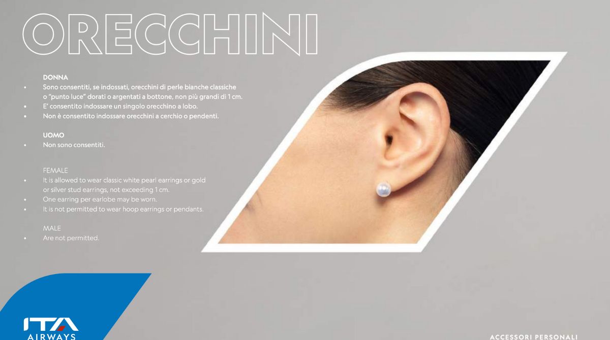 Capitolo a parte per tatuaggi o piercing. Per questo aspetto Ita si allinea agli altri vettori occidentali: sì al foro ai lobi, ma “no ai piercing visibili sulla lingua, alle sopracciglia, al naso”. Vietati anche i “gioielli dentali” e i “tatuaggi visibili”. Ita ha dunque deciso di consentire i tatuaggi a patto che siano nascosti dall’abbigliamento. In generale, i tatuaggi su avambracci, bicipiti, collo, viso e mani comportano sempre la mancata assunzione ai colloqui di lavoro. Gli orecchini sono assolutamente vietati agli uomini. Per le donne, sono ammesse le “perle bianche classiche o i punto luce dorati o argentati a bottone” ma non devono essere più grandi di un centimetro.