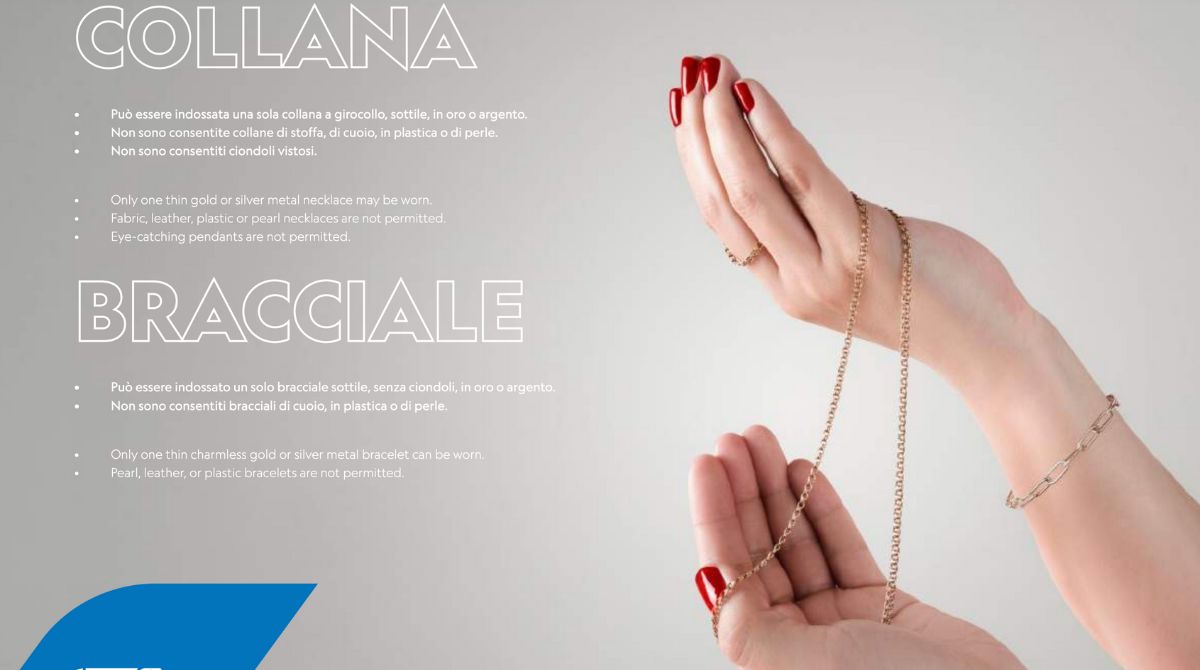“E’ consentito indossare un singolo orecchino a lobo. Non è consentito sfoggiare, invece, “orecchini a cerchio o pendenti”. Possono essere indossati al massimo 2 anelli sia per la donna che per l’uomo: in oro o argento, di stile tradizionale e dimensioni moderate. Non è consentito portare gli anelli al pollice; e neanche anelli con pendenti”. Nel 2017 il personale navigante di Alitalia ricevette un vademecum dove era previsto un capitolo dedicato alle donne con indicato come dovevano truccarsi. Tra i punti discussi c’era anche l’indicazione della biancheria intima che avrebbe dovuto essere “solo bianca o in colori neutri”. Al personale viaggiante è vietato masticare la gomma in divisa, fumare e tenere le braccia conserte o in tasca davanti ai passeggeri.
