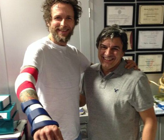 Brutto incidente per Lorenzo Jovanotti. Il cantante è caduto dalla bici, fratturandosi il polso sull’asfalto duro e scivoloso. “Ossa rotte natalizie“, ironizza Lorenzo Cherubini su Twitter dove posa con il gesso insieme al fisioterapista Fabrizio Borra. Più prodiga di dettagli è la moglie Francesca Valiani che, sul medesimo social network, pubblica un primo piano dell’ingessatura e delle escoriazioni alla gamba. “Vacanze finite”, dice la consorte del rapper che cerca di sdrammatizzare: “E’ che a lui il Natale piace festeggiarlo vedendo le stelle”.