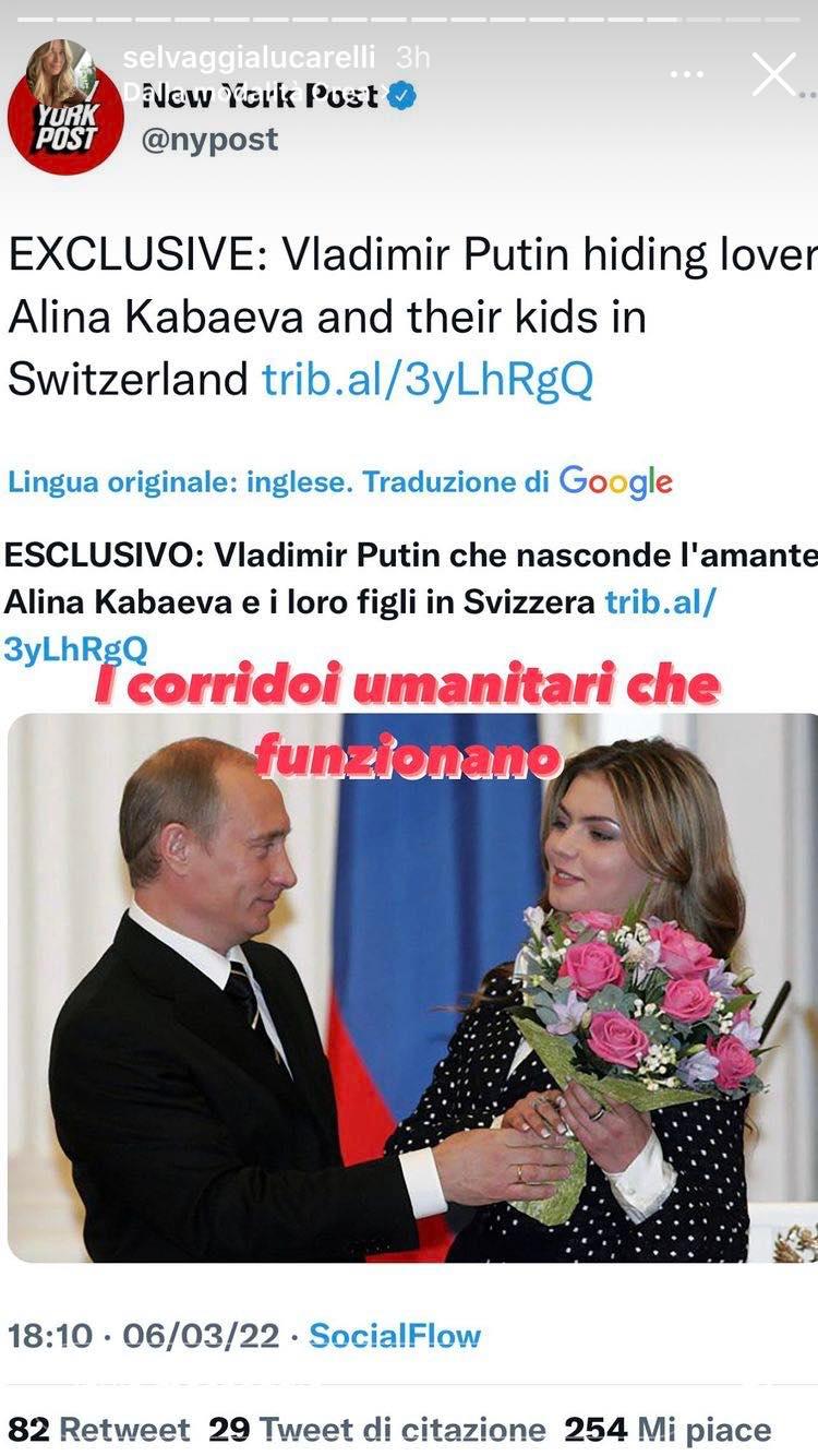 “Alina Kabaeva, l’amante di Vladimir Putin, si nasconde presumibilmente in Svizzera con i loro quattro figli”. L’indiscrezione bomba arriva da “Page Six”, la pagina di costume e gossip del “New York Post”. “Mentre Putin porta avanti il suo assalto all’Ucraina attaccando cittadini innocenti e causando una crisi di rifugiati, la sua famiglia è rintanata in uno chalet privato e sicuro da qualche parte in Svizzera, almeno per il momento”, scrive il sito citando una fonte.