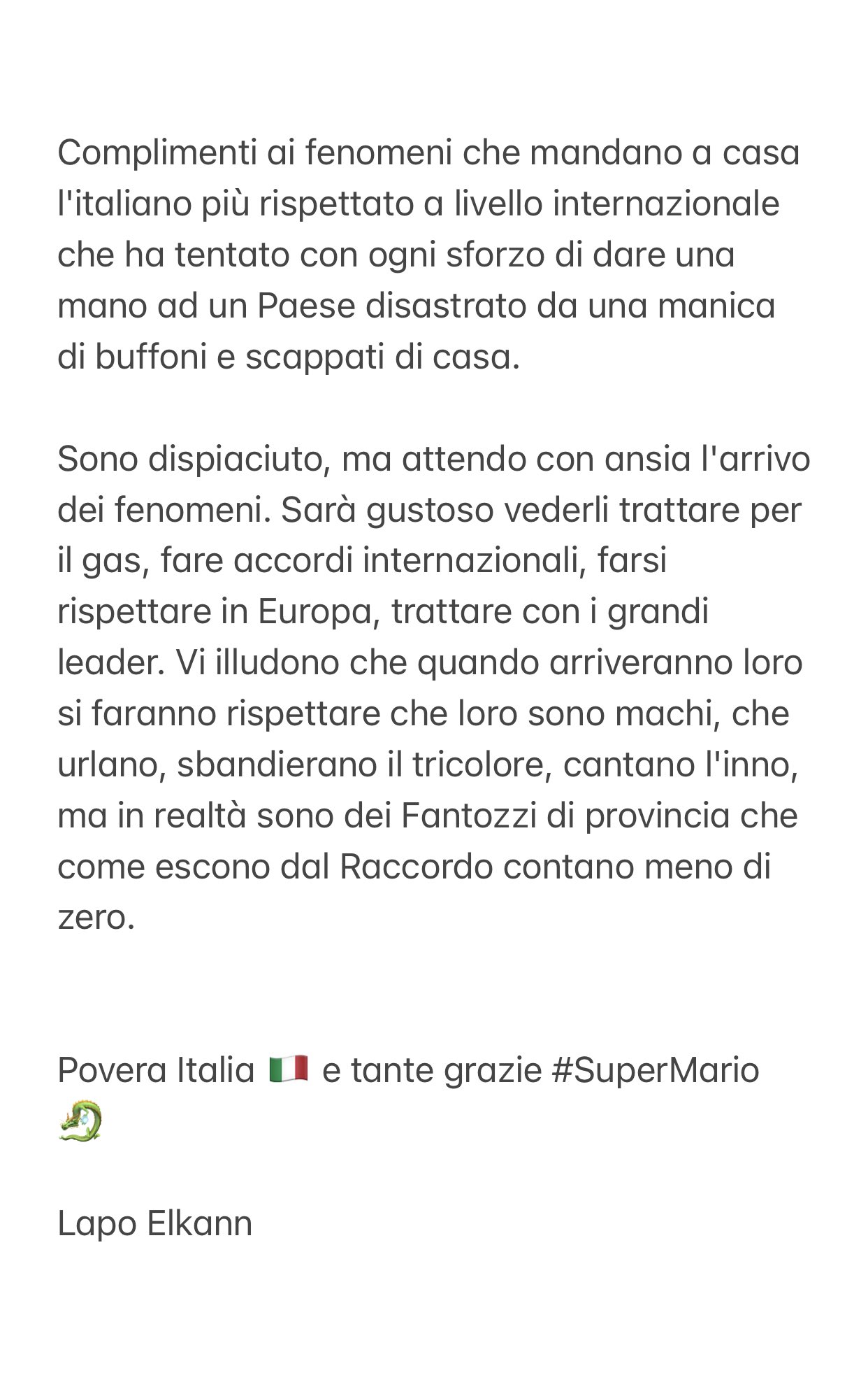 “Sono dispiaciuto, ma attendo con ansia l’arrivo dei fenomeni – aggiunge il rampollo di casa Agnelli – Sarà gustoso vederli trattare per il gas, fare accordi internazionali, farsi rispettare in Europa, trattare con i grandi leader. Vi illudono che quando arriveranno loro si faranno rispettare che loro sono machi, che urlano, sbandierano il tricolore, cantano l’inno, ma in realtà sono dei Fantozzi di provincia che come escono dal Raccordo contano meno di zero. Povera Italia e tante grazie #SuperMario”.