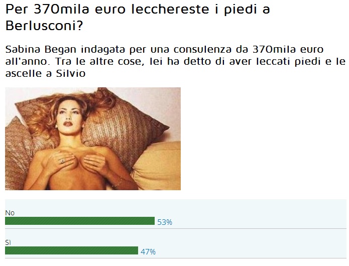 Il quotidiano Libero lancia una provocazione travestita da sondaggio, rivolgendosi direttamente ai suoi lettori: “Per 370mila euro lecchereste il piedi a Berlusconi?”. L’interrogativo nasce dai rumors secondo cui l’“Ape Regina” Sabina Began sarebbe stata ingaggiata dalla Infront, società straniera che si occupa di fare pubblicità alla Lega di Serie A.