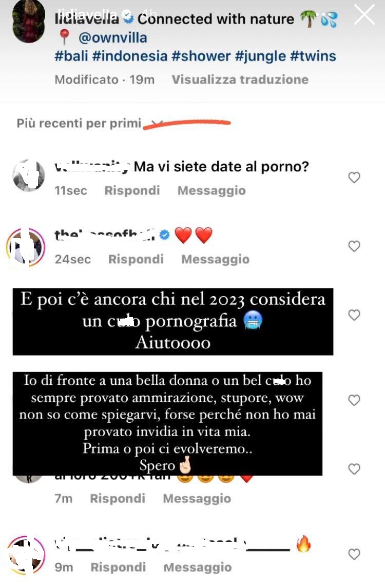 Più pungente Lidia che ha così replicato: “E poi c’è ancora chi nel 2023 considera un c**o p0rnografia. Aiutooooo! Io di fronte a una bella donna o un bel c**o ho sempre provato ammirazione, stupore, wow, non so come spiegarvi, forse perché non ho mai provato invidia in vita mia. Prima o poi ci evolveremo. Spero”.
