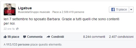 Nozze blindate per Luciano Ligabue che, lo scorso 7 settembre, ha sposato con rito civile la sua ex fisioterapista Barbara Pozzo. L’annuncio è stato dato dallo stesso rocker su Twitter e su Facebook.
