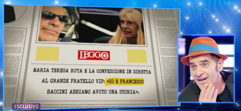 Durante la sua permanenza nella casa del “Grande Fratello Vip”, Maria Teresa Ruta ha raccontato di aver avuto in passato un flirt con Francesco Baccini. Il cantante ha negato tutto sia durante una sua incursione nella casa di Cinecittà su invito di Alfonso Signorini, sia ieri sera a “Live – Non è la D’Urso” dove è approdato per avere un confronto con Guenda Goria, figlia della Ruta.