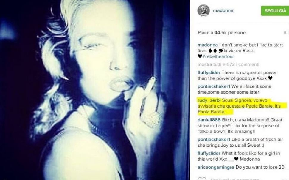 Clamorosa gaffe social da parte dello staff di Madonna. Sui profili Instagram, Twitter e Facebook della regina del pop è apparsa una foto accompagnata dalla seguente didascalia: “Non fumo ma mi piace accendere il fuoco”. Ai fan italiani della popstar è bastato poco per accorgersi che quella ritratta nell’immagine non era Madonna, bensì Paola Barale da giovane. Quest’ultima, agli inizi della sua carriera, ha sfruttato parecchio la sua somiglianza con la cantante americana prestandosi a servizi fotografici in cui imitava il look della signora Ciccone. L’ironia corre su Twitter. Sull’epic fail del giorno, probabilmente frutto di un errore del social media manager di Madonna, si stanno esprimendo in tanti. Tra i numerosi commenti spicca quello di Rudy Zerbi, giudice di “Tu sì que vales”. “Scusi Signora, volevo avvisarla che questa è Paola Barale. It’s Paola Barale”.