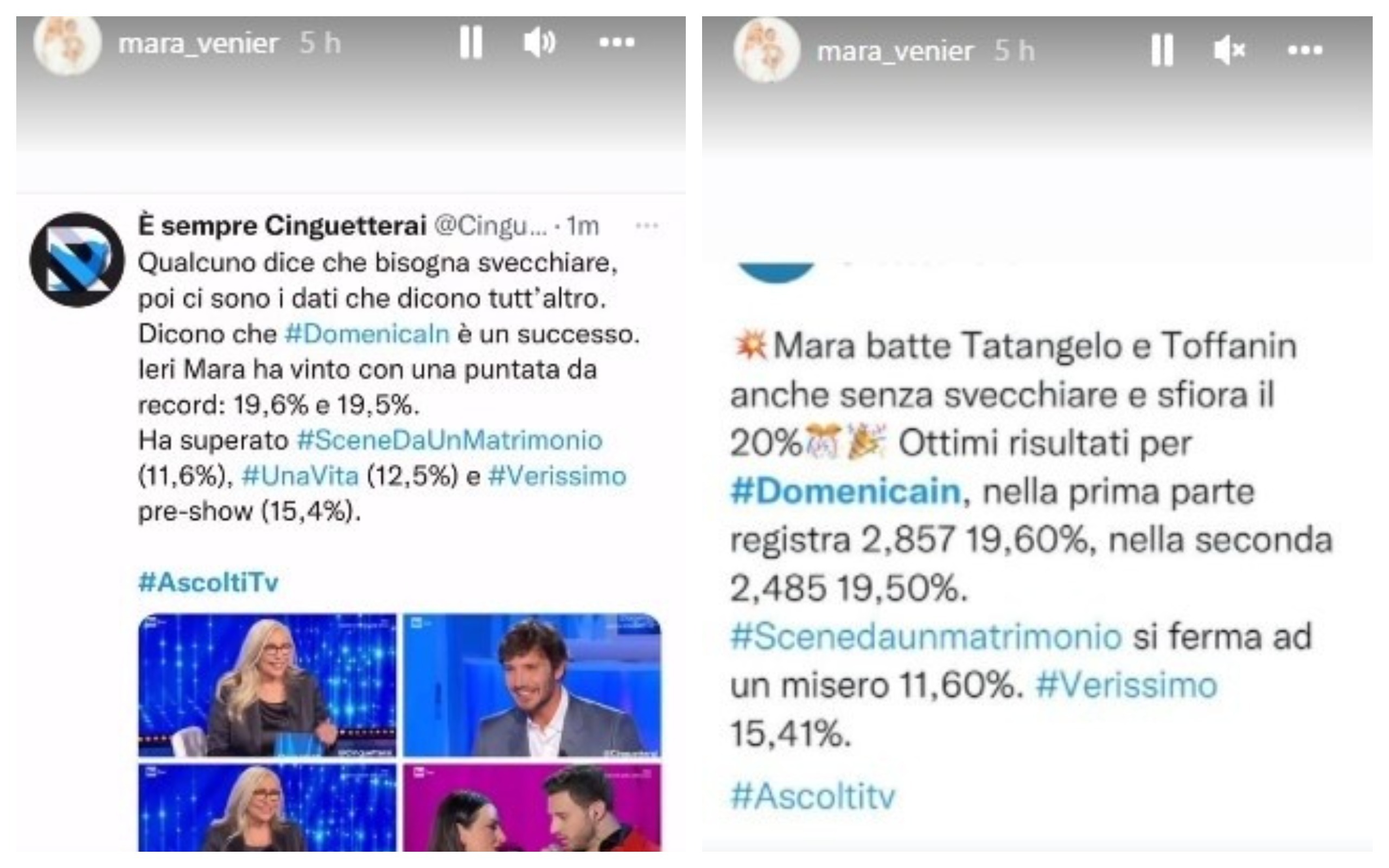 Come se non bastasse, stamani, dopo aver appresso del boom di ascolti registrato dalla puntata di ieri di “Domenica In”, la “zia Mara” ha rilanciato su Instagram gli articoli che sottolineavano il successo della sua trasmissione in barba a quanti suggeriscono di “svecchiare” un po’ la formula.