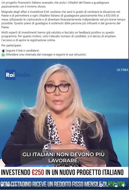L’immagine di Mara Venier usata, ancora una volta, per truffare gli italiani. A denunciarlo è la stessa conduttrice veneta che si è rivolta al suo avvocato Giorgio Assumma per tutelarsi dall’uso abusivo della sua immagine. La signora della domenica non le manda a dire a chi ha organizzato tutto: “Figli di pu***na truffatori”. “Ancora una volta sono la vittima inconsapevole ed incolpevole di un tentativo di truffa a danno di ingenui creduloni – racconta su Instagram – La fotografia delle mie sembianze, resa dinamica con la tecnologia della intelligenza artificiale, unita a quella di Elon Musk, invita gli italiani ad investire 250 euro in un progetto finanziario garantendo un ingente reddito fisso mensile”.