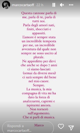 Amore al capolinea per Marco Carta e il fidanzato Sirio Campedelli. Ad annunciare la rottura avvenuta alcuni mesi fa è stato il cantante sardo in occasione dell’uscita del suo nuovo singolo. “Questa canzone parla di me, parla di te, parla di tutti noi – ha scritto su Instagram – Parla degli amori nati, finiti, sbocciati e appassiti. L’amore è sempre stata un’incredibile tempesta per me, un’incredibile avventura dal quale non sempre ne sono uscito al plurale. Ne approfitto per dirvi che anche se dopo sette anni ci siamo lasciati (ormai da diversi mesi) ci sarà sempre del bene nel mio cuore. Sempre. La musica, la mia compagna di vita, mi ha dato la forza di analizzarmi, capirmi e ispirarmi ancora. Non tornerò sull’argomento. Che si parli di musica. Marco”. Secondo il sito “Biccy”, Marco Carta avrebbe un nuovo fidanzato.