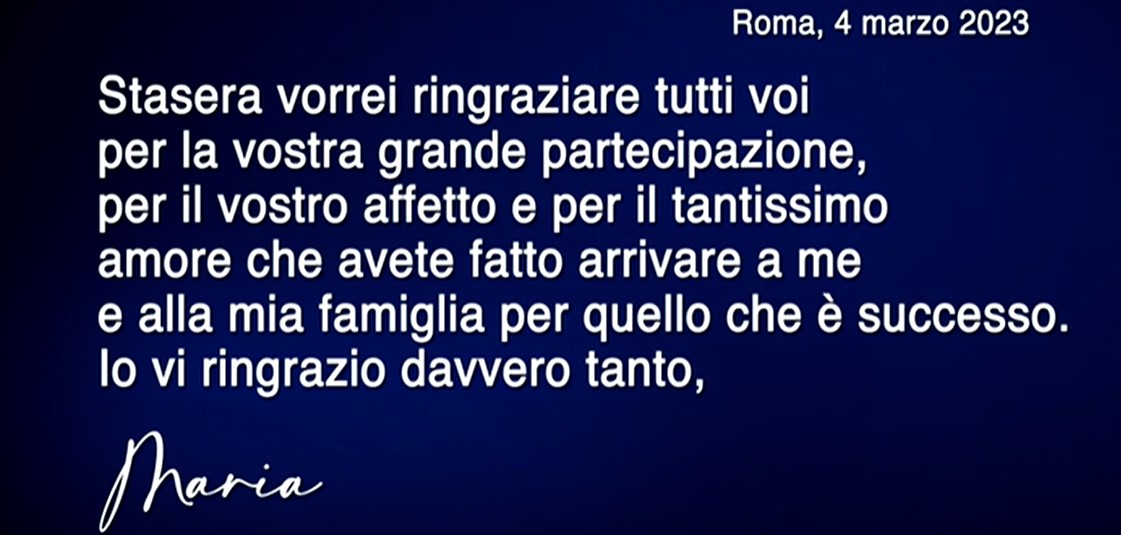 Il ringraziamento di Maria De Filippi