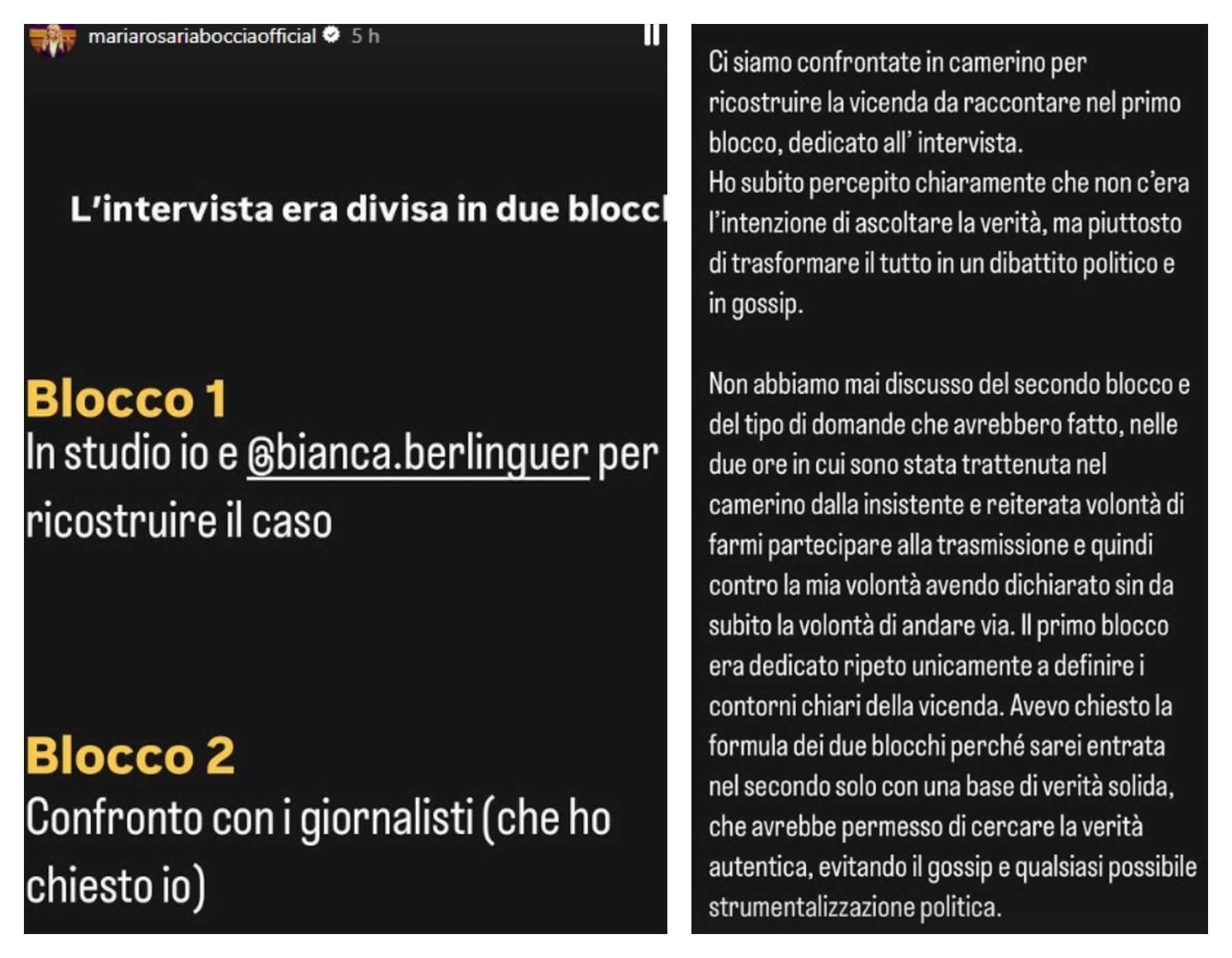 Dal canto suo, Maria Rosaria Boccia ha chiarito i motivi della sua mancata partecipazione a “E’ sempre Cartabianca” su Instagram. “L’intervista era divisa in due blocchi – ha spiegato – Blocco 1: In studio io e Bianca Berlinguer per ricostruire il caso. Blocco 2: Confronto con i giornalisti (che ho chiesto io). Ci siamo confrontate in camerino (con Bianca Berlinguer, ndr) per ricostruire la vicenda da raccontare nel primo blocco, dedicato all’intervista. Ho subito percepito chiaramente che non c’era l’intenzione di ascoltare la verità, ma piuttosto di trasformare il tutto in un dibattito politico e in gossip. Non abbiamo mai discusso del secondo blocco e del tipo di domande che avrebbero fatto, nelle due ore in cui sono stata trattenuta nel camerino dalla insistente e reiterata volontà di farmi partecipare alla trasmissione e quindi contro la mia volontà avendo dichiarato sin da subito la volontà di andare via. ll primo blocco era dedicato ripeto unicamente a definire i contorni chiari della vicenda. Avevo chiesto la formula dei due blocchi perché sarei entrata nel secondo solo con una base di verità solida, che avrebbe permesso di cercare la verità autentica, evitando il gossip e qualsiasi possibile strumentalizzazione politica”.