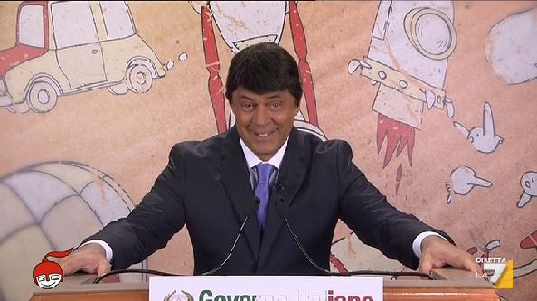 Maurizio Crozza debutta con la consueta ironia a “DiMartedì”, il nuovo talk show di approfondimento politico condotto da Giovanni Floris su La7. La prima copertina del comico genovese spazie dall'”annuncite” di Renzi all’inglese di Marchionne fino ai nuovi esilaranti personaggi di Maurizio Landini e Susanna Camusso. In apertura, Crozza propone l’imitazione del premier. “Giova tu sei la prova evidente che io mantengo le promesse – scherza – Senza nemmeno aspettare i mille giorni a te ti ho fatto fuori dalla Rai nei primi venti minuti”. Renzi viene anche paragonato all’iWatch: “E’ bello ma poi pensi: ‘A che m****** serve?”.