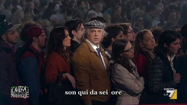 Cosa c’è di peggio della “sofferenza” di una turista in coda a Expo? Maurizio Crozza, con la consueta ironia, rivisita a modo suo “La ragazza di Ipanema” e si mette in fila. “Io in coda come un barbone, vedo laggiù un padiglione, mi sembra sia del Giappone – canta il comico genovese – Per vedere il video di un tonno, lo vedo su Sky col nonno“. Lo sketch è andato in onda ieri sera a “Crozza nel Paese delle Meraviglie“.