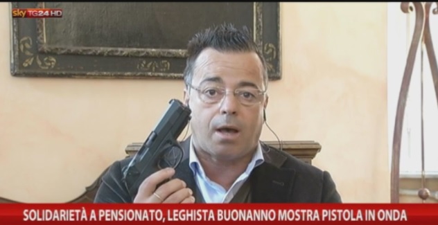 Gianluca Buonanno, sindaco di Borgosesia ed eurodeputato della Lega, ha lasciato senza parole la conduttrice e i telespettatori di SkyTg24. In collegamento esterno per parlare del caso del pensionato che ha ucciso un uomo per “legittima difesa” e promuovere il bonus armi a Varallo, Buonanno ha mostrato all’improvviso una pistola.