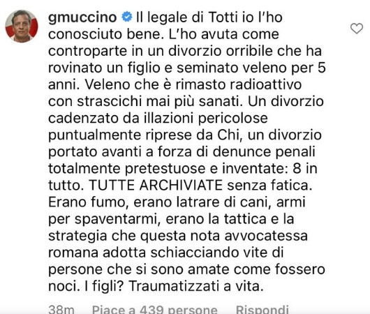 “Il legale di Totti io l’ho conosciuto bene – ha scritto Muccino su Twitter – L’ho avuta come controparte in un divorzio orribile che ha rovinato un figlio e seminato veleno per 5 anni. Veleno che è rimasto radioattivo con strascichi mai più sanati. Un divorzio cadenzato da illazioni pericolose puntualmente riprese da Chi, un divorzio portato avanti a forza di denunce penali totalmente pretestuose e inventate: 8 in tutto. E sono state TUTTE ARCHIVIATE senza fatica. Erano fumo, erano latrare di cani, armi per spaventarmi, erano la tattica e la strategia che questa nota avvocatessa romana adotta, schiacciando vite di persone che si sono amate come fossero noci. I figli? Traumatizzati a vita”.