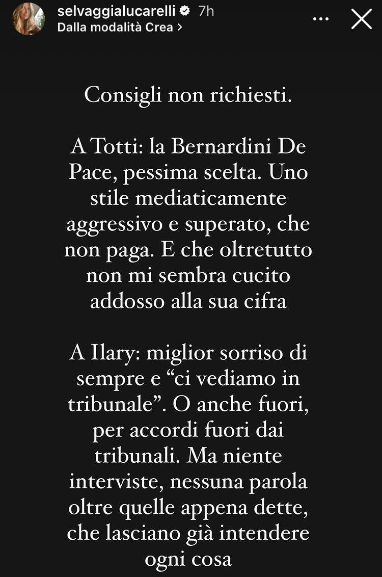 Nella querelle è entrata a gamba tesa anche Selvaggia Lucarelli. “Consigli non richiesti. A Totti: la Bernardini de Pace pessima scelta – ha sentenziato la giornalista tra le sue Instagram Stories – Uno stile mediaticamente aggressivo e superato, che non paga. E che oltretutto non mi sembra cucito addosso alla sua cifra”. La Lucarelli ha dato un “consiglio non richiesto” anche a Ilary Blasi: “Miglior sorriso di sempre e ‘ci vediamo in tribunale’. O anche fuori, per accordi fuori dai tribunali. Ma niente interviste, nessuna parola oltre quelle appena dette, che lasciano già intendere ogni cosa”.
