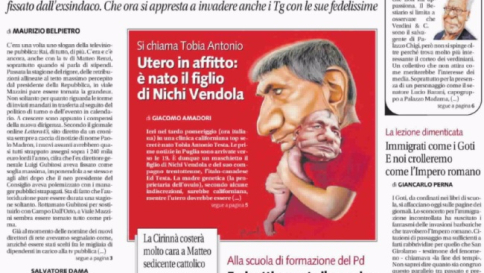 Fiocco arcobaleno per Nichi Vendola e il compagno italo-canadese Eddy Testa. Secondo quanto riporta il quotidiano “Libero”, i due sono diventati genitori di un bambino chiamato Tobia Antonio. Il piccolo è nato sabato 27 febbraio in una clinica californiana. A partorirlo è stata una donna indonesiana con passaporto statunitense. Il padre genetico è Eddy Testa, di quasi vent’anni più giovane di Nichi Vendola. La madre genetica sarebbe californiana. La coppia aspetta il riconoscimento formale della paternità, dopodiché potrà rientrare in Italia. L’ex governatore pugliese e leader di Sel non potrà fregiarsi del titolo di papà. Almeno non nel nostro Paese dove la stepchild adoption è al momento naufragata. La notizia non è stata al momento confermata dai diretti interessati.