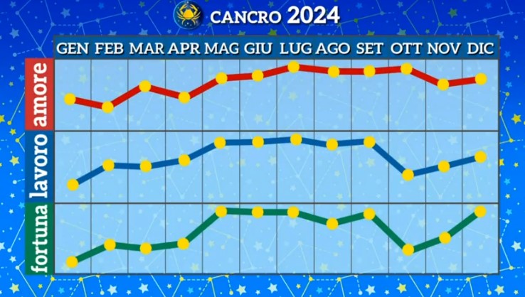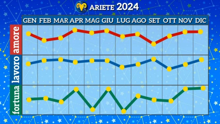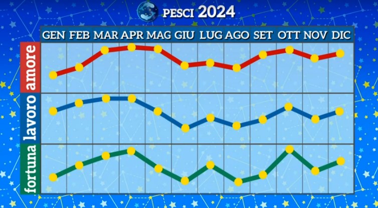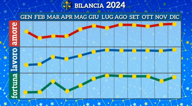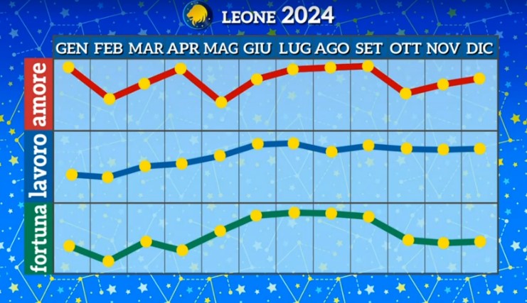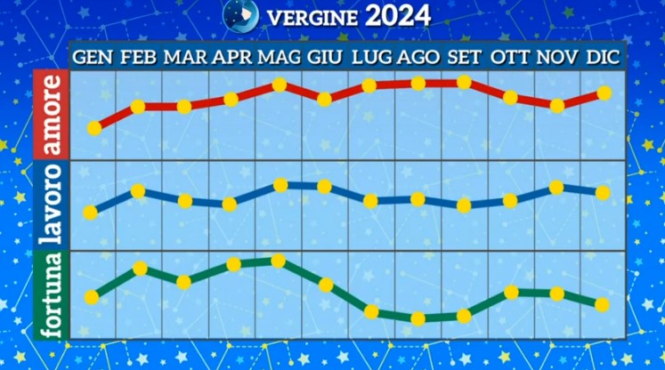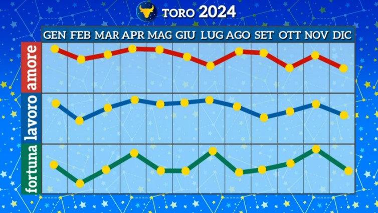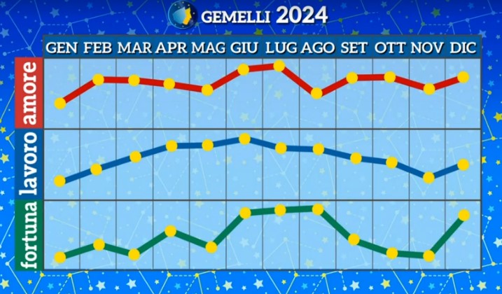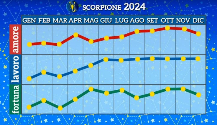 Gennaio è un mese che non promette molto bene, sarà un mese di assestamento. Da febbraio a maggio la situazione sentimentale sarà in crescita e anche chi è solo si troverà a decidere di iniziare un nuovo progetto sentimentale. Luglio, agosto e settembre saranno mesi importanti, anche perché ad agosto Venere sarà nel segno. Quindi quelli che vogliano fare una scelta sentimentale, avranno un’estate molto propizia. Per il lavoro: Saturno in opposizione vi mette nel caos, la prima parte dell’anno è migliore della seconda. Tra febbraio e marzo potrebbe esserci la necessità di chiudere delle situazioni che non vanno bene. L’ultima parte del 2024 pone obblighi, limiti, forse sarete voi a mettere dei paletti. La fortuna sarà concentrata soprattutto tra marzo e maggio.