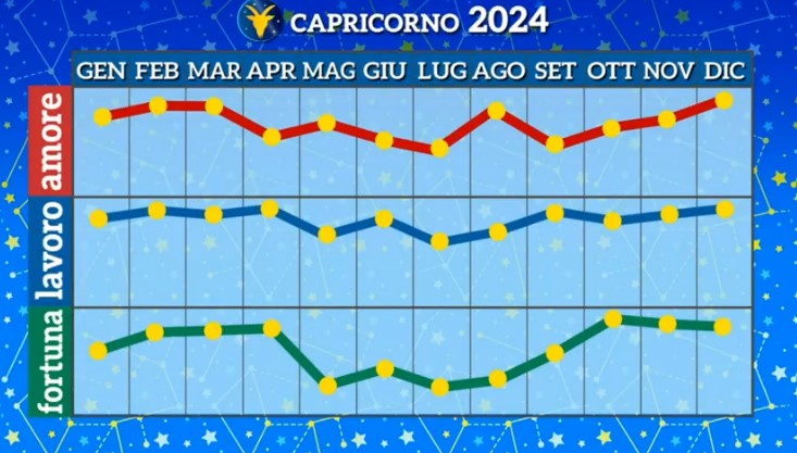 Cielo ancora una volta entusiasmante. Il segno Capricorno avrà molti pianeti a favore anche nel 2024. L’anno in arrivo confermerà ciò che è già stato confermato. Le stelle aiuteranno un buon recupero, anche per le questioni d’amore. L’anno partirà bene, la parte centrale – parlo dell’amore – sarà un po’ offuscata, ma perchè voi date più spazio alle questioni lavorative. Agosto sarà molto utile per le conoscenze. Novembre sarà un mese top per i sentimenti con Venere attiva nel segno. Il lavoro è tutto dalla vostra parte, questo potrebbe essere l’anno del ritorno in scena per chi è rimasto fermo. Non mancheranno consensi, avrete successo. Aprile e maggio saranno i mesi migliori per fare grandi scelte. Aprile e novembre saranno i mesi migliori per fortuna e incontri.