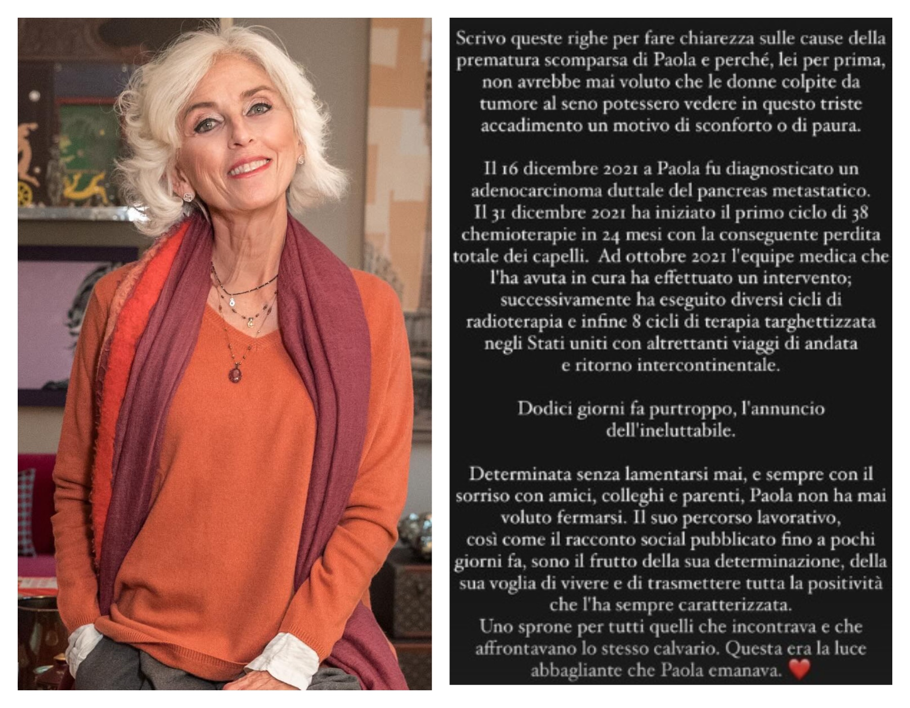 Domenico, il marito di Paola Marella, ripercorre le tappe della malattia affrontata dalla moglie in una Instagram Story. “Scrivo queste righe per fare chiarezza sulle cause della prematura scomparsa di Paola e perché, lei per prima, non avrebbe mai voluto che le donne colpite da tumore al seno potessero vedere in questo triste accadimento un motivo di sconforto o di paura. Il 16 dicembre 2021 a Paola fu diagnosticato un adenocarcinoma duttale del pancreas metastatico”, tiene a precisare sul profilo Instagram della consorte che si è spenta sabato 21 settembre a 61 anni all’ospedale San Raffaele di Milano.