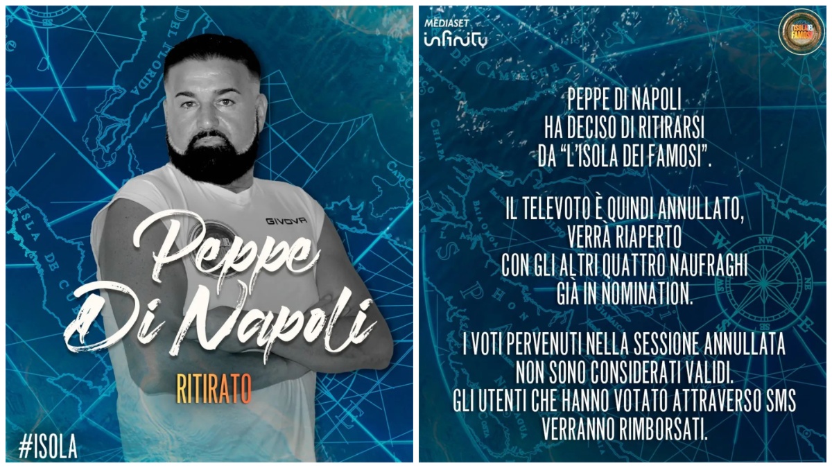 Dopo il suo ritiro, la produzione ha annullato il televoto e ne ha aperto un altro con i restanti nominati. “Peppe Di Napoli ha deciso di ritirarsi da L’Isola dei Famosi – recita il comunicato ufficiale diramato dalla produzione -Il televoto è quindi annullato, verrà riaperto con gli altri quattro naufraghi già in nomination: Artur Dainese, Maité Yanes, Alvina Verecondi Scortecci e Khady Gueye. I voti pervenuti nella sessione annullata non sono considerati validi. Gli utenti che hanno votato attraverso SMS verranno rimborsati”.