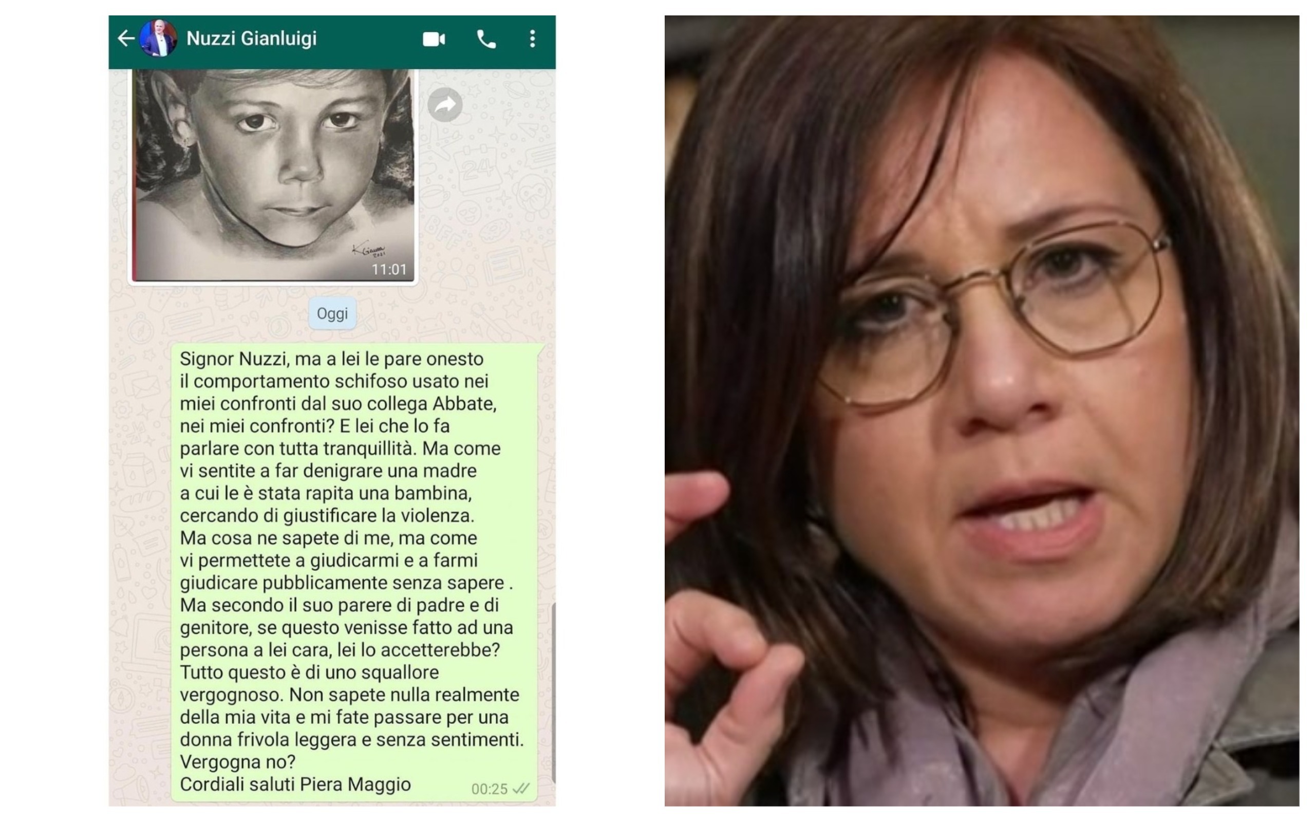 “VERGOGNOSO – recita il messaggio – Signor Nuzzi, ma a lei le pare onesto il comportamento schifoso usato nei miei confronti dal suo collega Abbate, nei miei confronti? E lei che lo fa parlare con tutta tranquillità. Ma come vi sentite a far denigrare una madre a cui le è stata rapita una bambina, cercando di giustificare la violenza. Ma cosa ne sapete di me, ma come vi permettete a giudicarmi e a farmi giudicare pubblicamente senza sapere. Ma secondo il suo parere di padre e di genitore, se questo venisse fatto ad una persona a lei cara, lei lo accetterebbe? Tutto questo è di uno squallore vergognoso. Non sapete nulla realmente della mia vita e mi fate passare per una donna frivola, leggera e senza sentimenti. Vergogna no? Cordiali saluti Piera Maggio”.