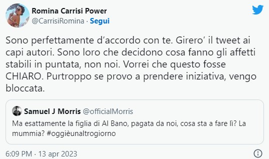 Nelle scorse ore, la quartogenita di Al Bano Carrisi e Romina Power ha condiviso sul suo account Twitter il cinguettio non proprio lusinghiero di un utente che si chiedeva: “Ma esattamente la figlia di Al Bano, pagata da noi, cosa sta a fare lì? La mummia? #oggièunaltrogiorno”. “Sono perfettamente d’accordo con te – ha replicato Romina Jr. – Girerò il tweet ai capi autori. Sono loro che decidono cosa fanno gli affetti stabili in puntata, non noi. Vorrei che questo fosse CHIARO. Purtroppo se provo a prendere iniziativa, vengo bloccata”.