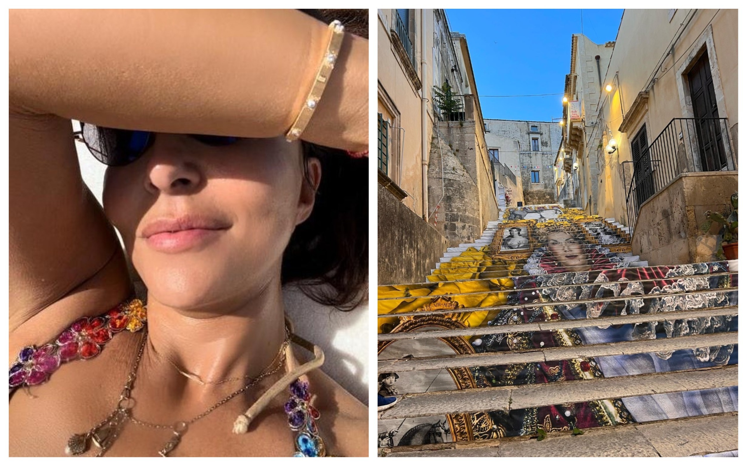 L’attrice ha mostrato la scalinata di via Fratelli Bandiera abbellita da Carlo Coniglio, Palazzo Ducezio e piazza Mazzini dove si è immortalata mano nella mano con il marito Flavio Cattaneo. Non mancano gli scatti al mare.