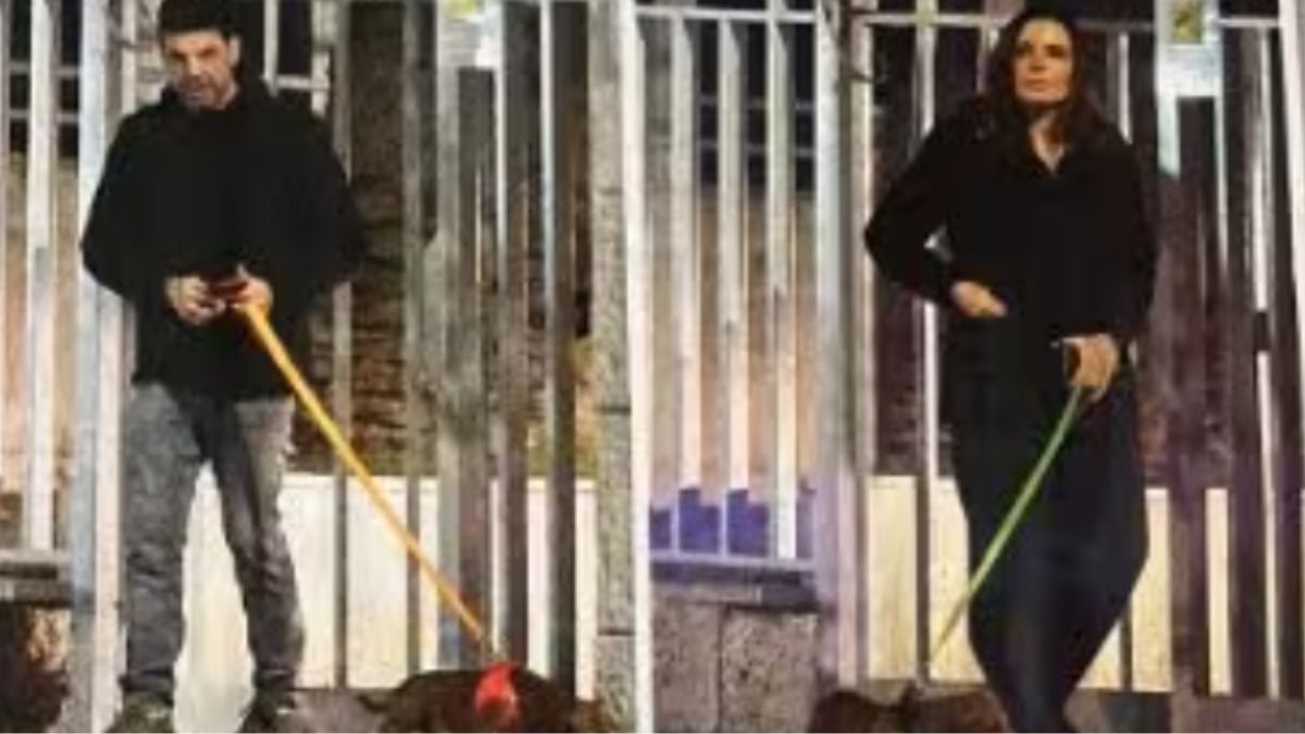 In uno scatto si vedono i due che si alternano nel portare fuori il cane uscendo dallo stesso cancello