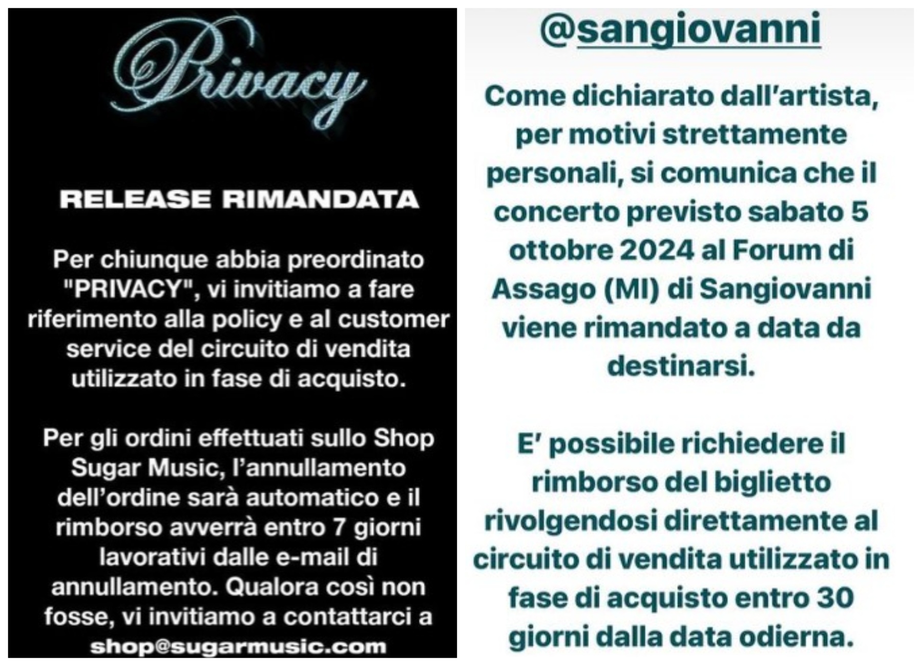 “L’uscita del mio album ‘Privacy’ e il concerto al Forum di Assago del 5/10 sono rimandati – fa sapere – Per chi ha messo amore e fiducia in questo progetto preacquistando i biglietti del Forum o il disco riceverà il rimborso, i dettagli sono tutti nelle storie. Ho ricevuto tantissimo sostegno che non mi aspettavo e tantissima comprensione che per me in questo momento rappresentano la cosa più importante, anche perché mi sembra di sentire che quello che vivo io tocca tante persone e mi fa sentire meno solo. Davvero grazie”.