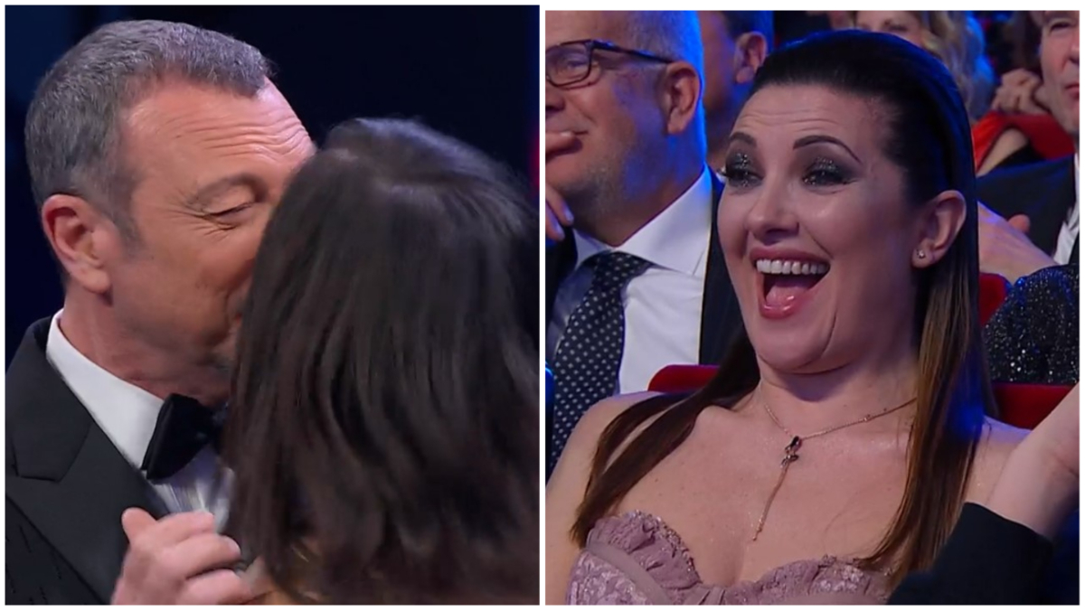L’attrice e conduttrice spagnola ha chiesto ad Amadeus di farle da “cavia” per illustrare il saluto all’italiana: stretta di mano più doppio bacio che spesso sfocia in momenti di imbarazzo quando le teste vanno nella stessa direzione. Imbarazzo che ha fatto sì che Amadeus e Rocío si baciassero sulle labbra.