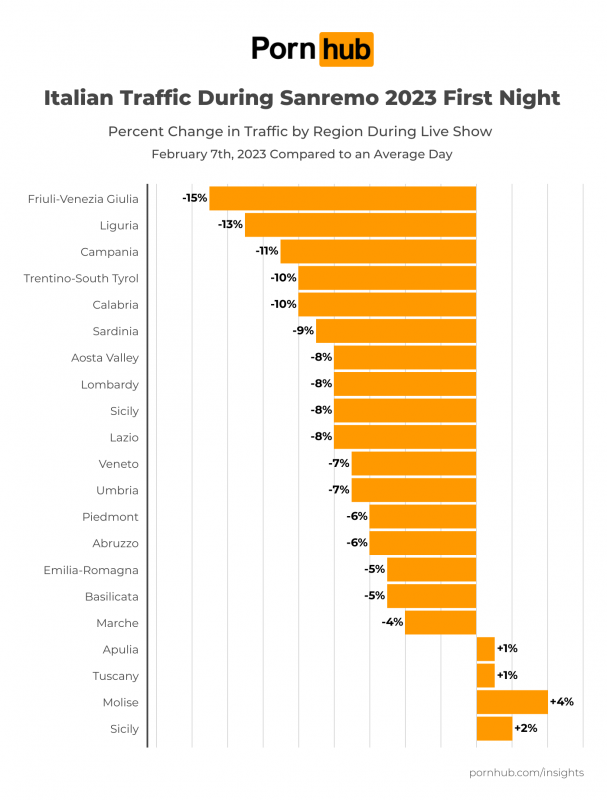 Pornhub, la piattaforma leader mondiale dell’intrattenimento per adulti, ha registrato un calo di traffico da record, -17%, durante la prima serata della 73esima edizione del “Festival di Sanremo” andata in onda martedì 7 febbraio. I dati sono stati analizzati in esclusiva per “Rolling Stone Italia”. La prima serata della kermesse ha tenuto incollati al video 10 milioni e 757 mila spettatori per uno share del 62,4%, il più alto dal ’95. Accanto ad Amadeus, oltre a Gianni Morandi, anche Chiara Ferragni alla sua prima esperienza in tv.