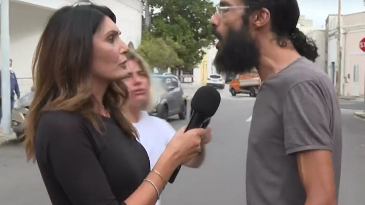 Alberto Matano apre il collegamento con Barbara Di Palma raccontando quello che era appena accaduto. L’uomo aveva lanciato in aria i microfoni delle due giornaliste avvicinandosi minacciosamente come per volerle aggredire fisicamente. Il conduttore ha chiesto all’inviata di chiamare i carabinieri e di raccontare ciò che era accaduto. “Ti prego di non avvicinarti a questa persona che è una persona violenta” dice subito Alberto Matano. “Io sono ancora un po’ agitata, mi guardo le spalle perché lui si è appena allontanato – spiega la cronista -. Ha fatto una sfuriata inenarrabile in pieno delirio. Sono scese tutte le persone del paese. Urlava e camminava in mezzo alla strada. Sono scesi tutti per capire cosa stava accedendo. Lui è stato molto violento sia con me, che con la collega. Ci ha strappato anche i microfoni dalle mani. Poi quelle sue espressioni facciali, quell’aggressività e quelle parole dure… Penso non ci sia bisogno di spiegazioni. Eccolo di nuovo!”.