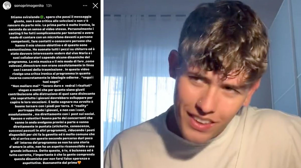 Il cantante nel suo testo scrive: “Oggi comincia Amici e non ti hanno considerato, non funziona come credi, ti hanno illuso e poi scartato e starai seduto sul divano, ma volevi avere un banco non sarai abbastanza bravo oppure non hai i capelli afro colorati oppure ricci, o non sei abbastanza personaggio per la De Filippi”. E ancora: “Non hai fatto né Sanremo giovani né X Factor non hai fatto i capricci sulle schede e poi sul palco e non sei con l’etichetta di un cognome americano, non hai fatto disco d’oro con i capelli di platino, fai musica non commerciale e questo ti fa onore, non parli dei tuoi drammi dei tuoi drammi d’amore e la critica non è la selezione, più che giusta, ma il messaggio che fate passare in ogni post su Instagram in cui fate passare Amici come un programma per tutti, quando già sapete bene chi saranno i vostri eletti”. Primogenito ha poi postato una Story su Instagram in cui chiarisce il senso del suo messaggio: “Non c’è rancore da parte mia, la mia musica e il mio modo di fare non erano assolutamente in linea con i canoni della trasmissione”.