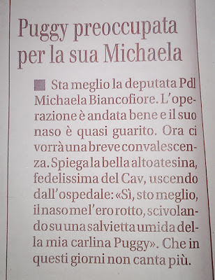 Al quotidiano, diretto da Sallusti, la parlamentare svela: “Il naso me l’ero rotto scivolando su una salvietta umida della mia carlina Puggy“. Stando all’articolo, la cagnolina, mascotte della campagna elettorale di Berlusconi – vuoi per il rimorso, vuoi per la lontananza forzata dalla padrona – è triste e non canta più l’inno del Pdl. Per fortuna, le due presto si ricongiungeranno e avranno come recuperare il tempo perduto grazie al periodo di convalescenza che attende la Biancofiore.