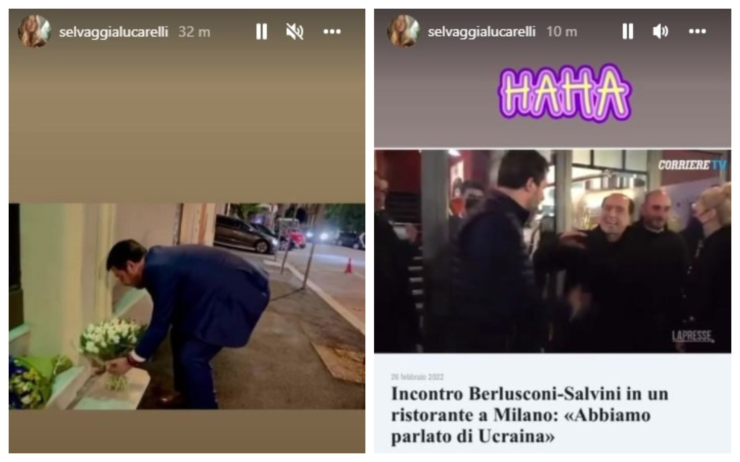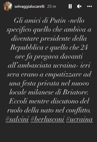 Selvaggia Lucarelli riprende ironicamente anche una dichiarazione rilasciata da Matteo Salvini all’uscita del ristorante e riportata da “La Presse”: “Una serata di relax ma tra mille problemi che ci sono un’ora di relax ci stava. Non abbiamo parlato di centrodestra ma di Ucraina. Domani mattina andrò a portare il mio saluto e il mio sostegno al console ucraino. Se volete, ci vediamo lì” (GUARDA IL VIDEO).
