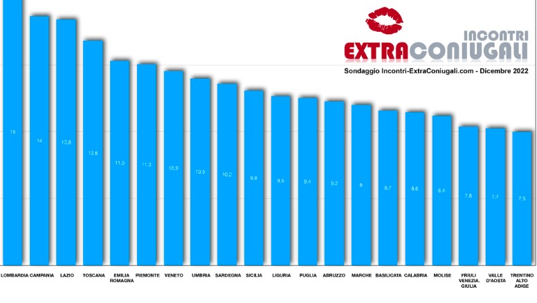 La regione italiana dove si trascorre più tempo sotto le lenzuola (e non per dormire) è la Lombardia con 3,75 rapporti a settimana, ovvero 15 al mese. Seguono la Campania (14 volte al mese) e il Lazio (13,8). Al quarto posto, appena fuori dal podio, la Toscana (12,6) seguita da Emilia-Romagna (11,5), Piemonte (11,3), Veneto (10,9), Umbria (10,5) e Sardegna (10,2). A chiudere la top ten è la Sicilia (9,8).