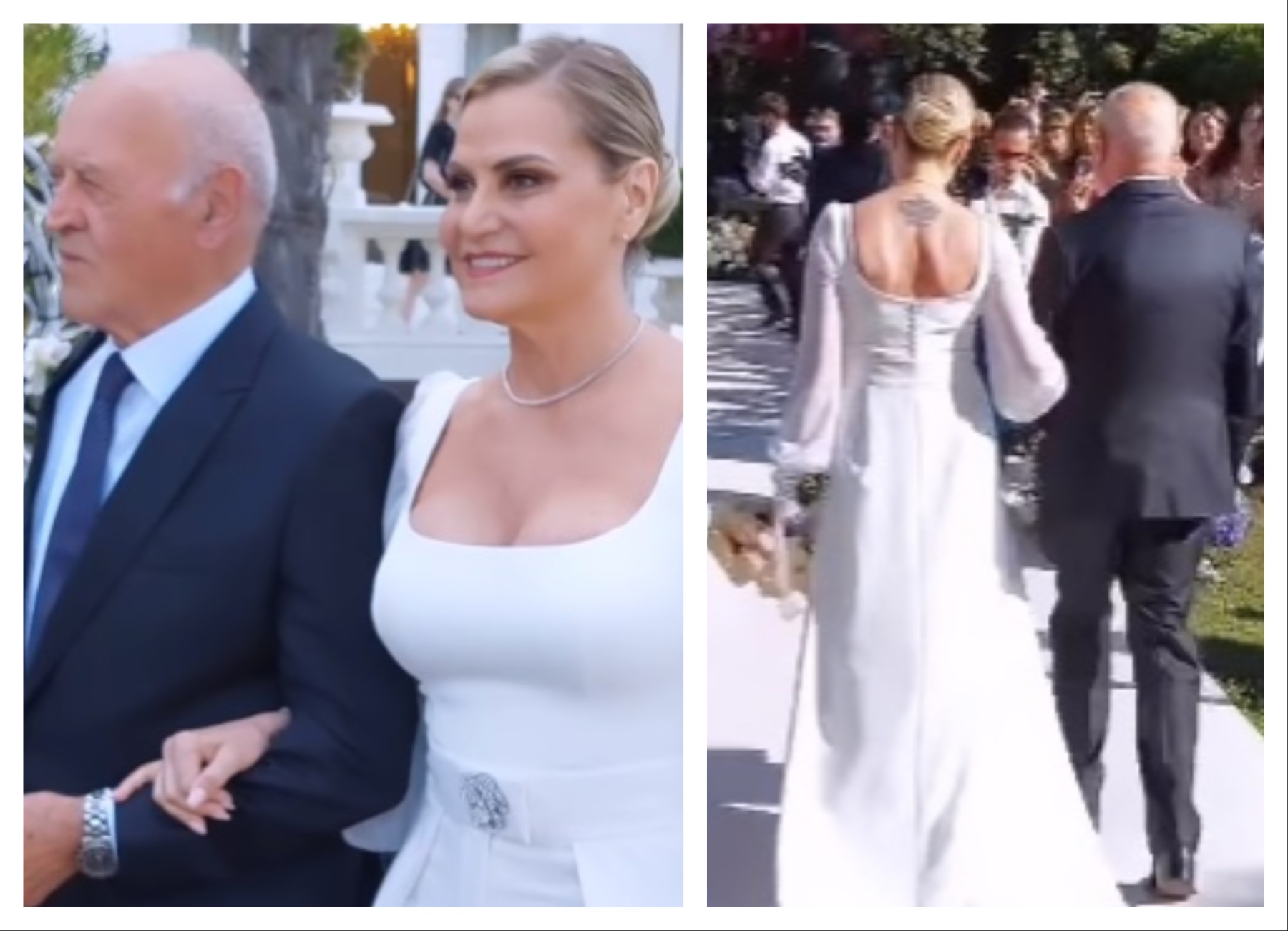 Per il sì, Simona Ventura ha indossato una tuta bianca con scollo quadrato e maniche velate. A completare il tutto una cintura decorata con brillantini dalla quale scendeva una lunga gonna bianca. Le prime immagini sono state diffuse attraverso l’account Instagram di “Chi”.