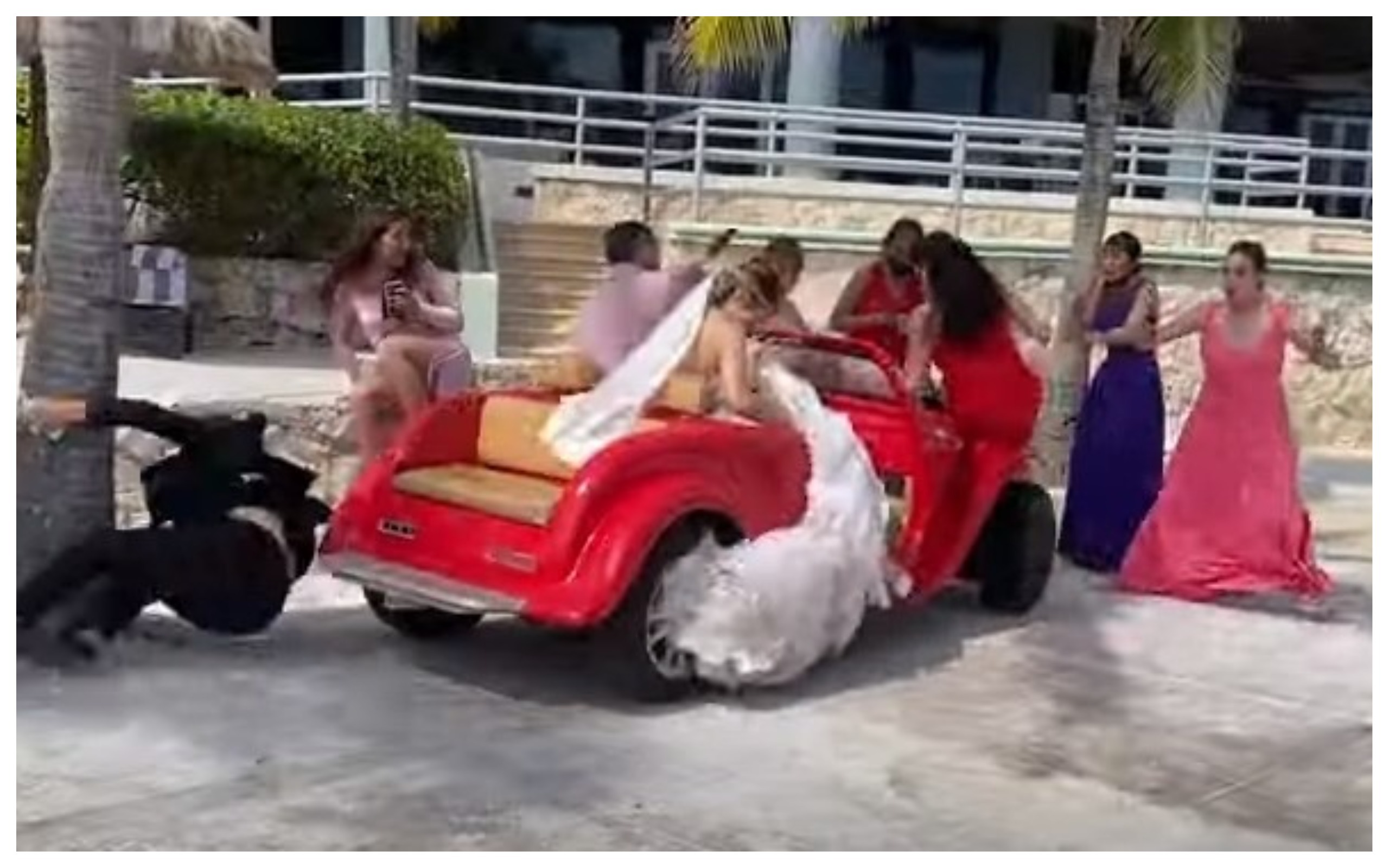 Lo sposo stava guidando una golf car quando ha perso il controllo dell’auto travolgendo una delle damigelle (la ragazza che nel video indossa un abito rosso, ndr.) che è volata per aria.