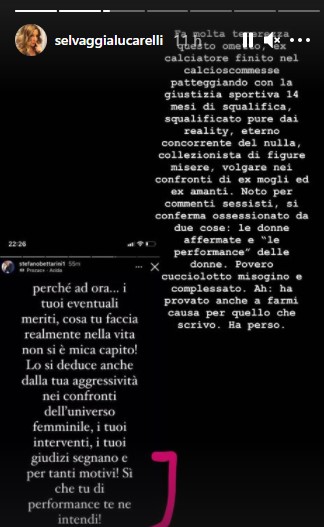 Immediata la replica di Selvaggia Lucarelli: “Fa molta tenerezza questo ometto, ex calciatore finito nel calcioscommesse patteggiando con la giustizia sportiva 14 mesi di squalifica, squalificato pure dai reality, eterno concorrente del nulla, collezionista di figure misere, volgare nei confronti di ex mogli ed ex amanti. Noto per commenti sessisti, si conferma ossessionato da due cose: le donne affermate e ‘le performance’ delle donne. Povero cucciolotto misogino e complessato. Ah: ha provato anche a farmi causa per quello che scrivo. Ha perso”.