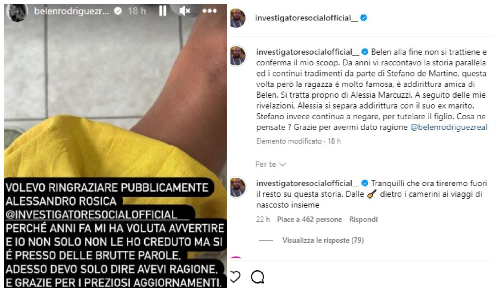 Nelle scorse ore il gossipparo Alessandro Rosica, anche noto come ‘Investigatore social’, ha riesumato tutta una serie di vecchi post sull’affaire “De Martino-Marcuzzi” lamentando di non essere stato preso in considerazione da nessuno all’epoca. A cominciare dalla stessa Belen Rodriguez che, a quanto pare, aveva ignorato i suoi avvertimenti al punto da rompere con lui. La showgirl argentina ha ripreso a seguire Alessandro Rosica sui social e gli ha persino rivolto un post di scuse. “Volevo ringraziare pubblicamente Alessandro Rosica perché anni fa mi ha voluta avvertire e io non solo non gli ho creduto ma si è preso delle brutte parole. Adesso devo solo dire che avevi ragione e grazie per i preziosi aggiornamenti”, ha scritto l’ex signora De Martino in una Instagram Story.