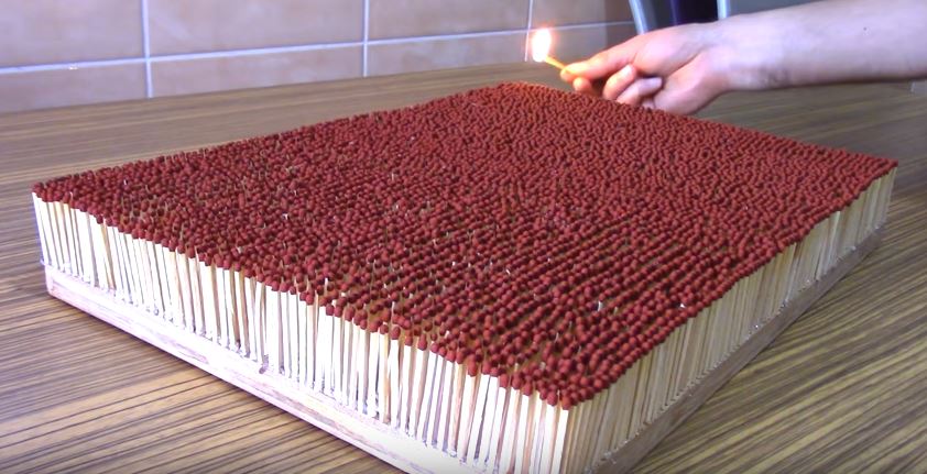 Avete mai provato ad accendere contemporaneamente 6000 fiammiferi? Il risultato di questo “esperimento” è illustrato in un video che in pochi giorni ha registrato oltre un milione di visualizzazioni. Una volta accesi, i fiammiferi creano un suono rilassante a metà tra il fruscio del vento tra le foglie degli alberi e il rumore delle onde dell’oceano. Nel video condiviso dal canale HTD, i fiammiferi prendono fuoco creando un effetto domino e si appassiscono in un cumulo che assomiglia a delle liquirizie.