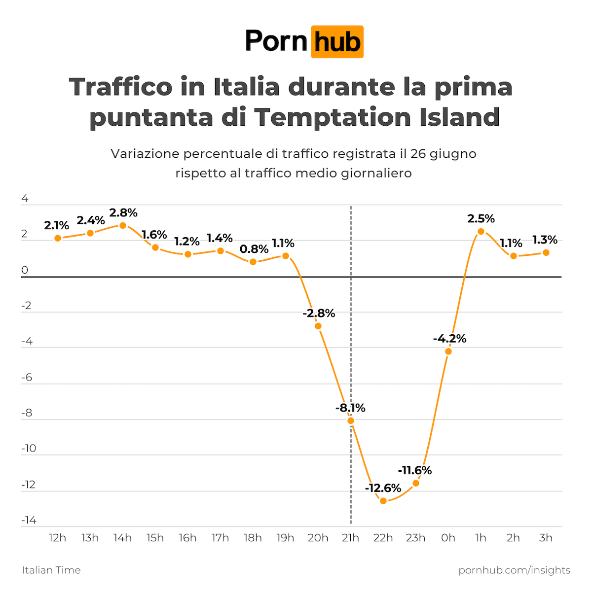 Pornhub, la piattaforma leader mondiale nell’intrattenimento per adulti, ha registrato un calo di traffico del -12,6% durante la prima puntata di “Temptation Island” andata in onda lunedì 26 giugno in prima serata su Canale 5. A dirlo è un’analisi effettuata da “Rolling Stone Italia”. “In Italia il traffico ha iniziato a scendere intorno alle 21:00, segno che gli spettatori erano già davanti alla tv aspettando l’inizio, e ha toccato il picco in negativo intorno alle 22:00, per poi risalire verso la fine del programma”, si legge. Un po’ come accaduto lo scorso febbraio in occasione del 73esimo “Festival di Sanremo”. Per la cronaca, la prima puntata di “Temptation Island” ha radunato davanti al televisore 3.558.000 spettatori per il 26.14% di share.