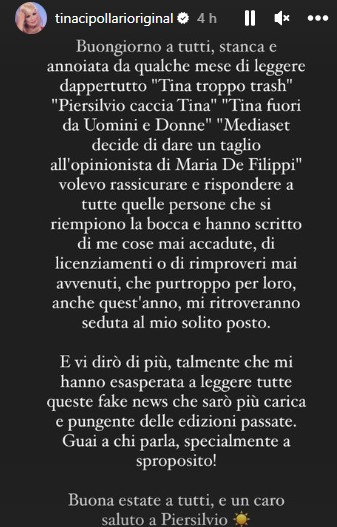 Dopo giorni di rumors e veleni, Tina Cipollari ha rotto il silenzio e ha tranquillizzato quanti temono di non vederla più su Canale 5. “Buongiorno a tutti – ha esordito – stanca e annoiata da qualche mese di leggere dappertutto ‘Tina troppo trash’, ‘Pier Silvio caccia Tina’, ‘Tina fuori da Uomini e Donne’, ‘Mediaset decide di dare un taglio all’opinionista di Maria De Filippi’”. “Volevo rassicurare e rispondere a tutte quelle persone che si riempiono la bocca e hanno scritto di me mai accadute, di licenziamenti o di rimproveri mai avvenuti – ha continuato – Purtroppo per loro anche quest’anno mi troveranno seduta al mio solito posto”. “E vi dirò di più, talmente che mi hanno esasperata a leggere tutte queste fake news che sarò più carica e pungente delle edizioni passate – ha concluso – Guai a chi parla, specialmente a sproposito! Buona estate a tutti e un caro saluto a Pier Silvio!”.