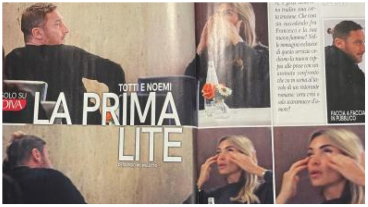 La tensione è palpabile. I volti dell’ex calciatore e della flower designer sono scuri e, mentre lui gesticola, lei si asciuga le lacrime. La discussione, piuttosto animata, sarebbe scoppiata per colpa di uno smartphone. Secondo il settimanale, tra Totti e Noemi non ci sarebbe nessuna crisi. Si sarebbe trattato di una semplice baruffa d’amore. La coppia è pronta ad iniziare una nuova vita e a trascorrere insieme il primo Natale nella nuova casa di circa 270 metri quadri composta da dieci vani di cui tre bagni e una terrazza panoramica con vista sulla città e sulla piscina condominiale.